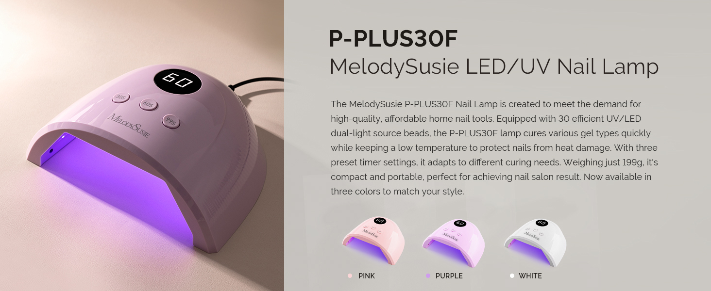 The MelodySusie Plus30F UV Nail Lamp features 36 watts of dual LED UV light with 30 beads for fast, low-heat curing of all gel nail types. Equipped with a smart auto sensor and three timer settings (30s, 60s, 99s), it offers hands-free, customizable drying. Its compact, acetone-resistant design includes ventilation for heat dissipation and durability, boasting a lifespan of up to 50,000 hours. Ideal for both professional salons and at-home nail enthusiasts, this lamp combines efficiency, convenience, and trusted quality.