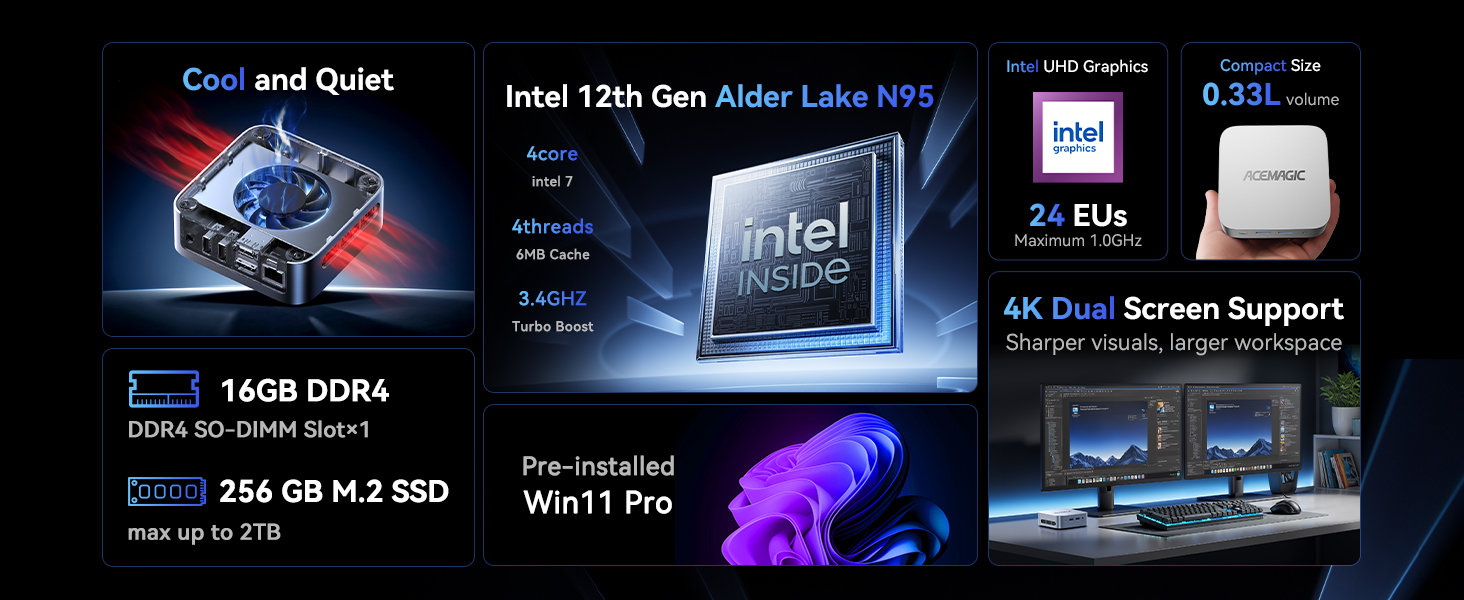 The ACEMAGIC Mini PC 11 Pro packs a punch with its 3.4 GHz Alder Lake N95 quad-core processor, 16GB DDR4 RAM, and 256GB SSD, delivering 45% faster performance than similar models. Its compact 3.9-inch footprint fits seamlessly into any workspace, while dual 4K UHD display support and versatile connectivity options make it perfect for business and home use. Silent cooling and VESA mount compatibility add to its sleek, professional appeal.